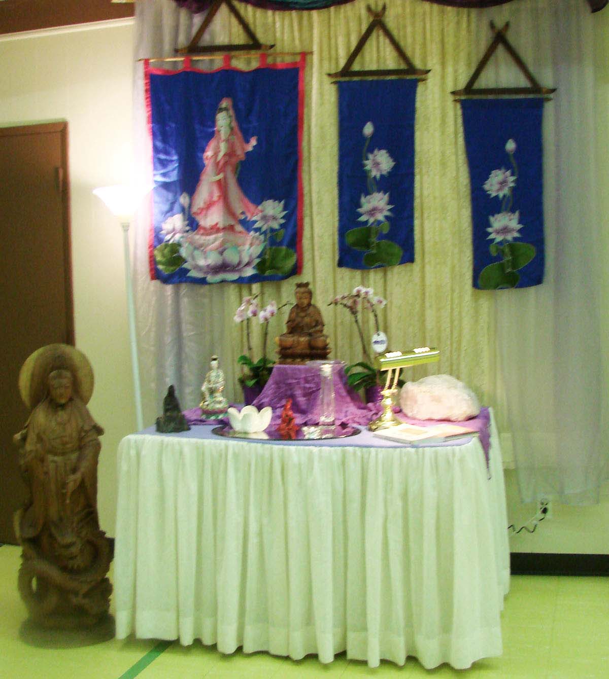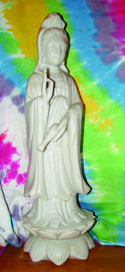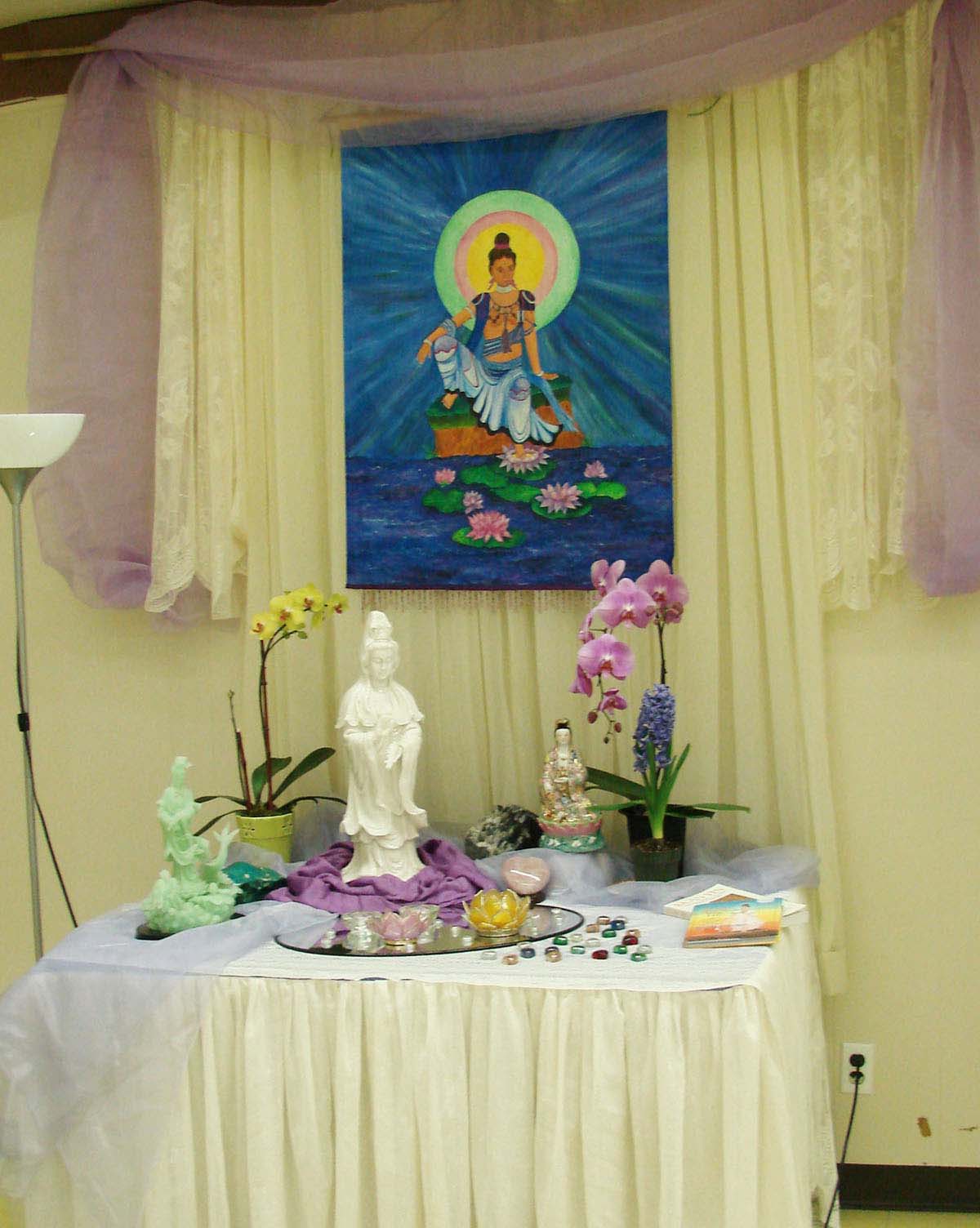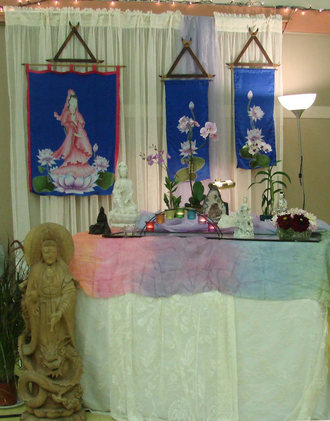 Another altar at the Spring Festival of Awareness. In the back ground is a hand painted image by Nywyn and in front a marble carving from Vietnam. To the right is a glass painted Quan Yin and to her left is a Glow in the Dark Quan Yin with her dragon.