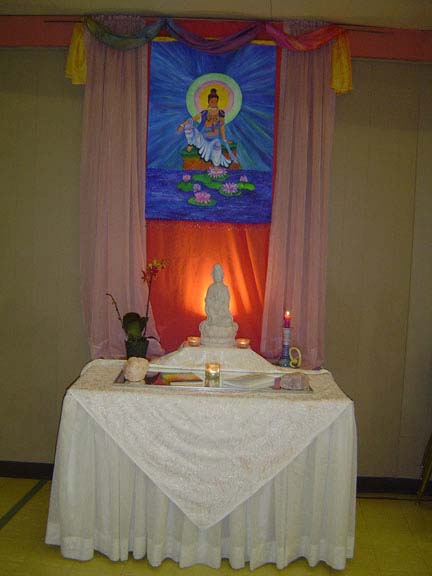 One of the QuanYin altars at the Wise Womens Festival. In the back ground is a silk batik painted in Bali and a wood statue carved in Vietnam. Another wood carving sits on top surronded by orchids and a 20 pound rose quart crystal to ther right.