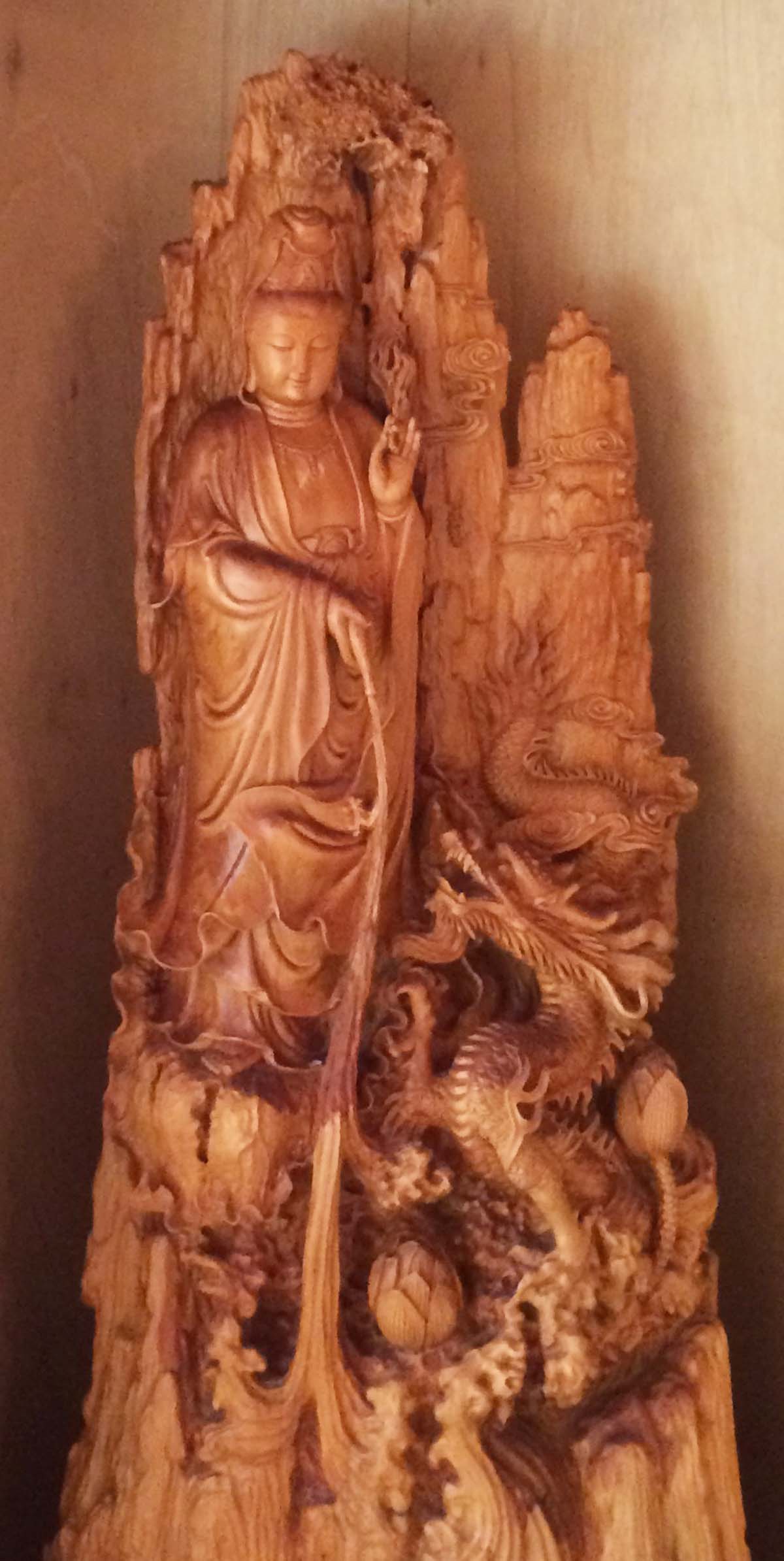 Yellow cedar log carved in China. Story of purchase in my book. She pours the gift of water in her left and a stalk of rice in her right. She has tamed her dragon and thus he looks loving at her.