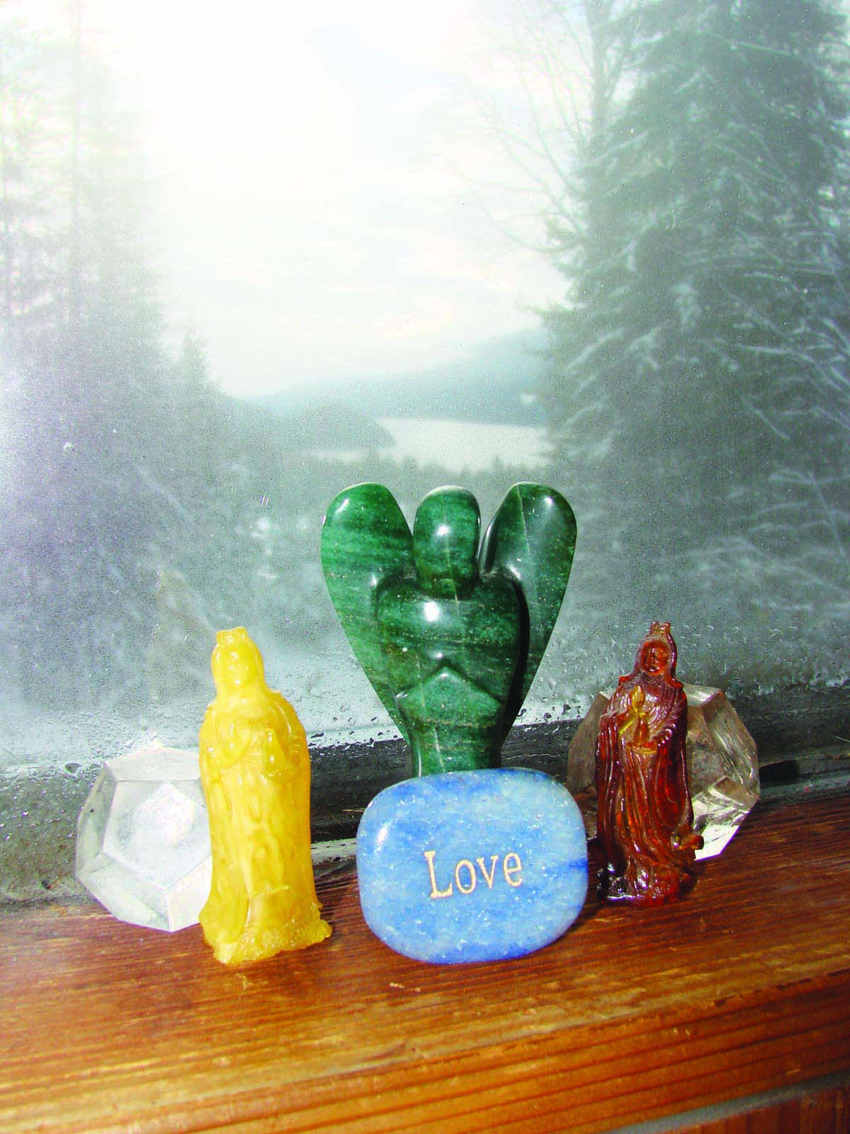 Two of the tiniest QuanYins in my collection. I bought these two hand-carved statues, one in dark and the other in golden amber, at a trade show in Vernon. She had a booth beside mine and said they were from Lithuania. In the background is the view from my bedroom window at Johnson’s Landing. Plus, a malachite angel and other crystals.
