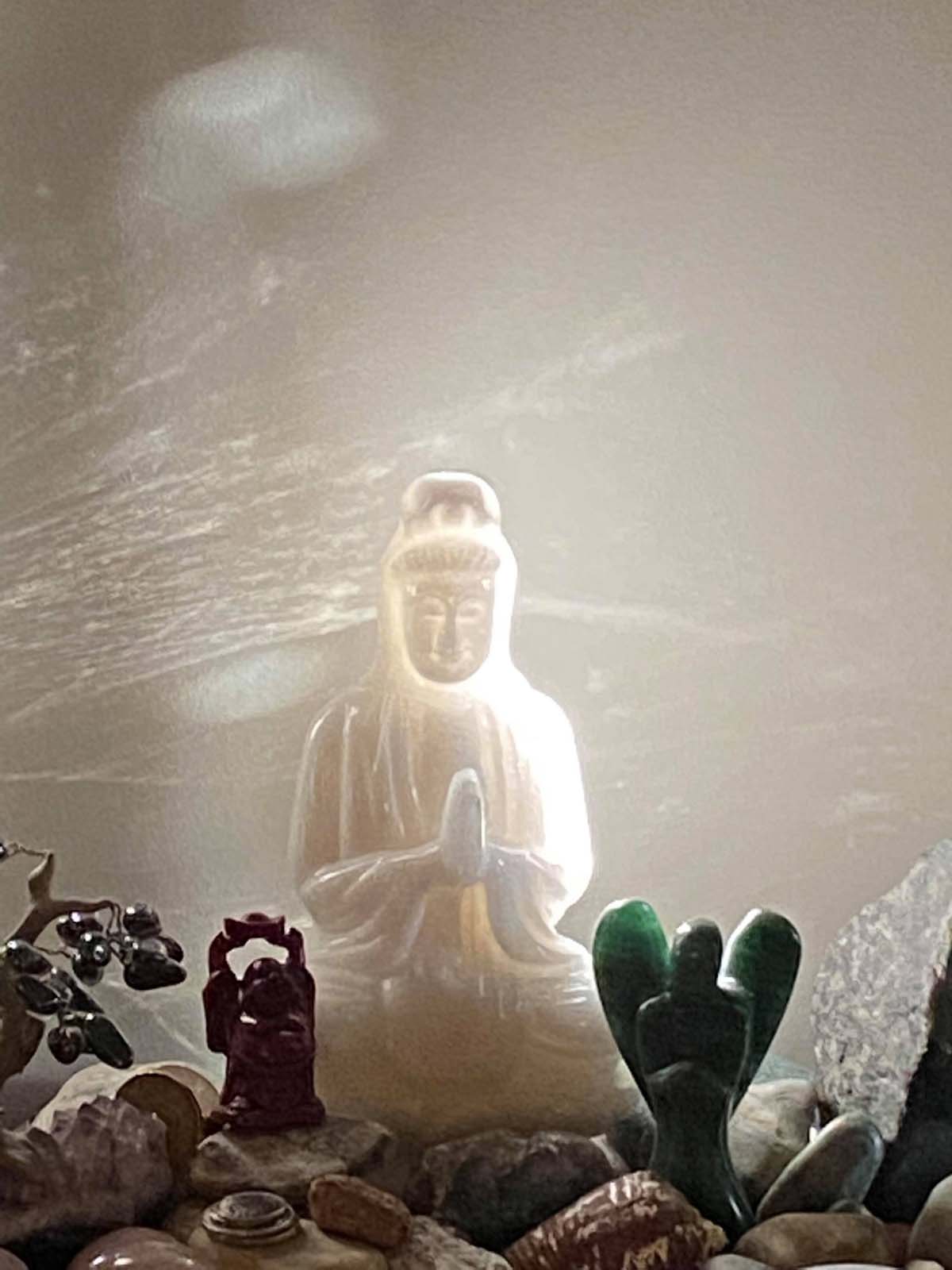A friend clicked her camera when she saw light glowing around the malachite angel and QuanYin I gifted her with.